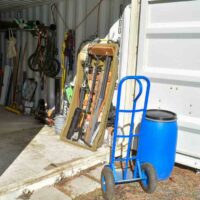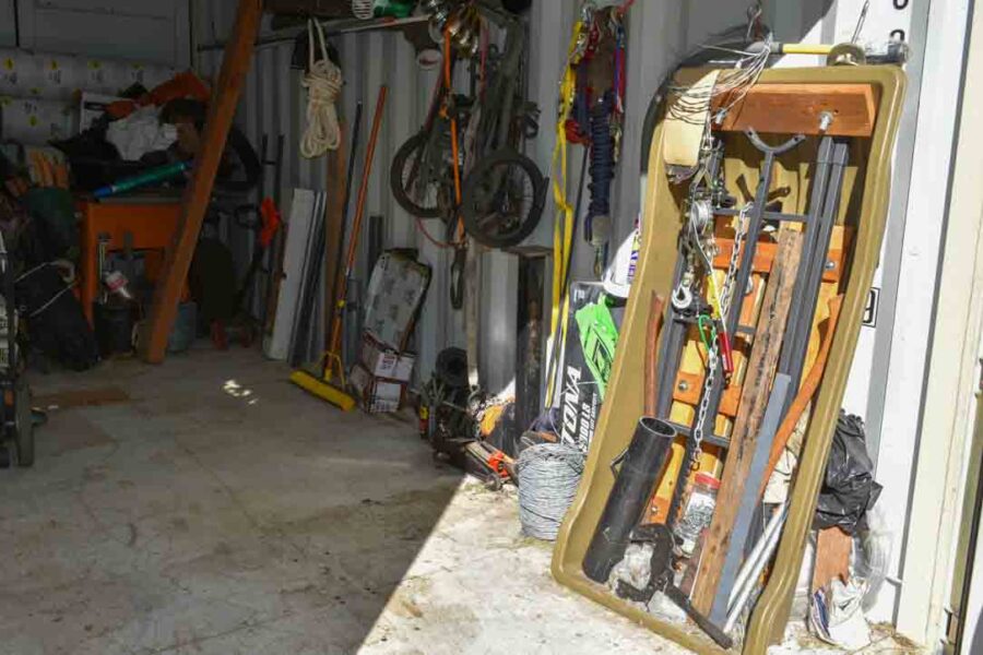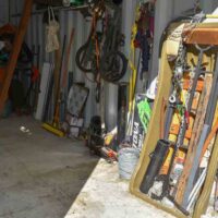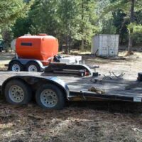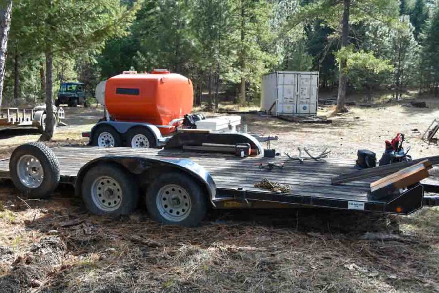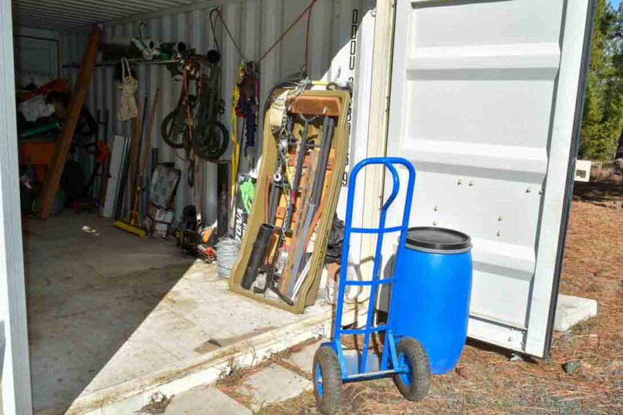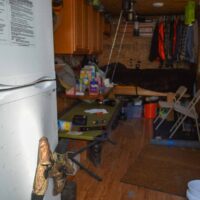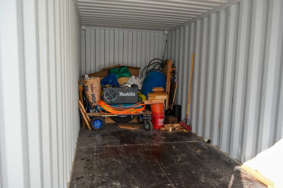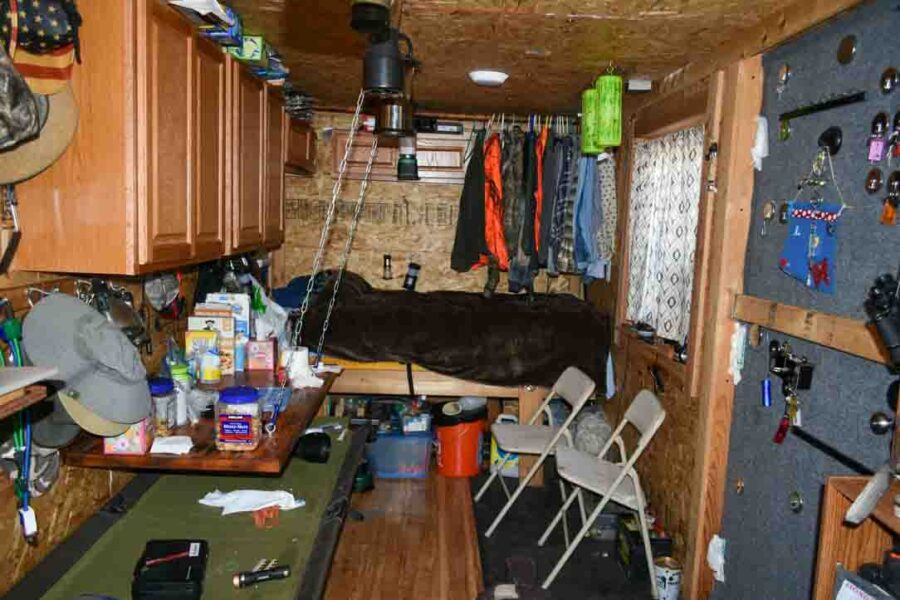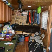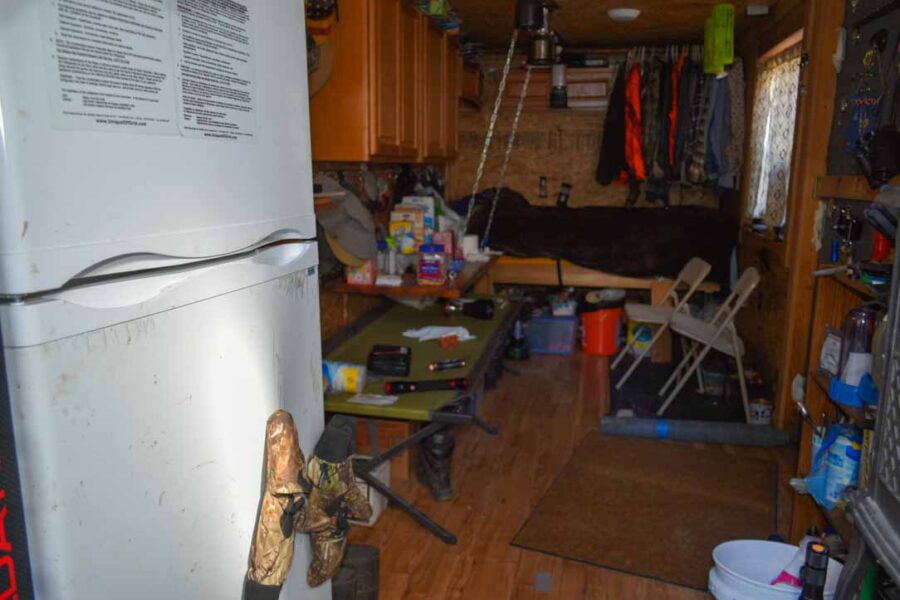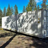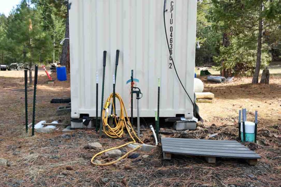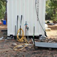 There are 2 windows with 3/16”, 1” x 4” metal frames, plus frames with security bars and curtains, stainless steel windows and door flashing for rain protection. Insulated metal door with outdoor carpeting on door inside to prevent condensation. Sleeping quarters container has double doors insulated, wafer board paneling, stainless screws & washers with no nails used. There are 8 vents with 1 manual camper vent wired for outside electrical hookup and floodlights. Numerous magnets holds door carpet intact with a place to hang keys. Metal door frame inside has brackets to holds 2”x 4” horizontally blocking door on inside from opening with dead bolt. Vinyl flooring. The heated outhouse has padded seat and flush toilet, hardy plank siding, metal roof, 100 foot drain field, and 50 gallon outside water barrel. Toilet can be hooked to hose with 250 gallon septic tank.